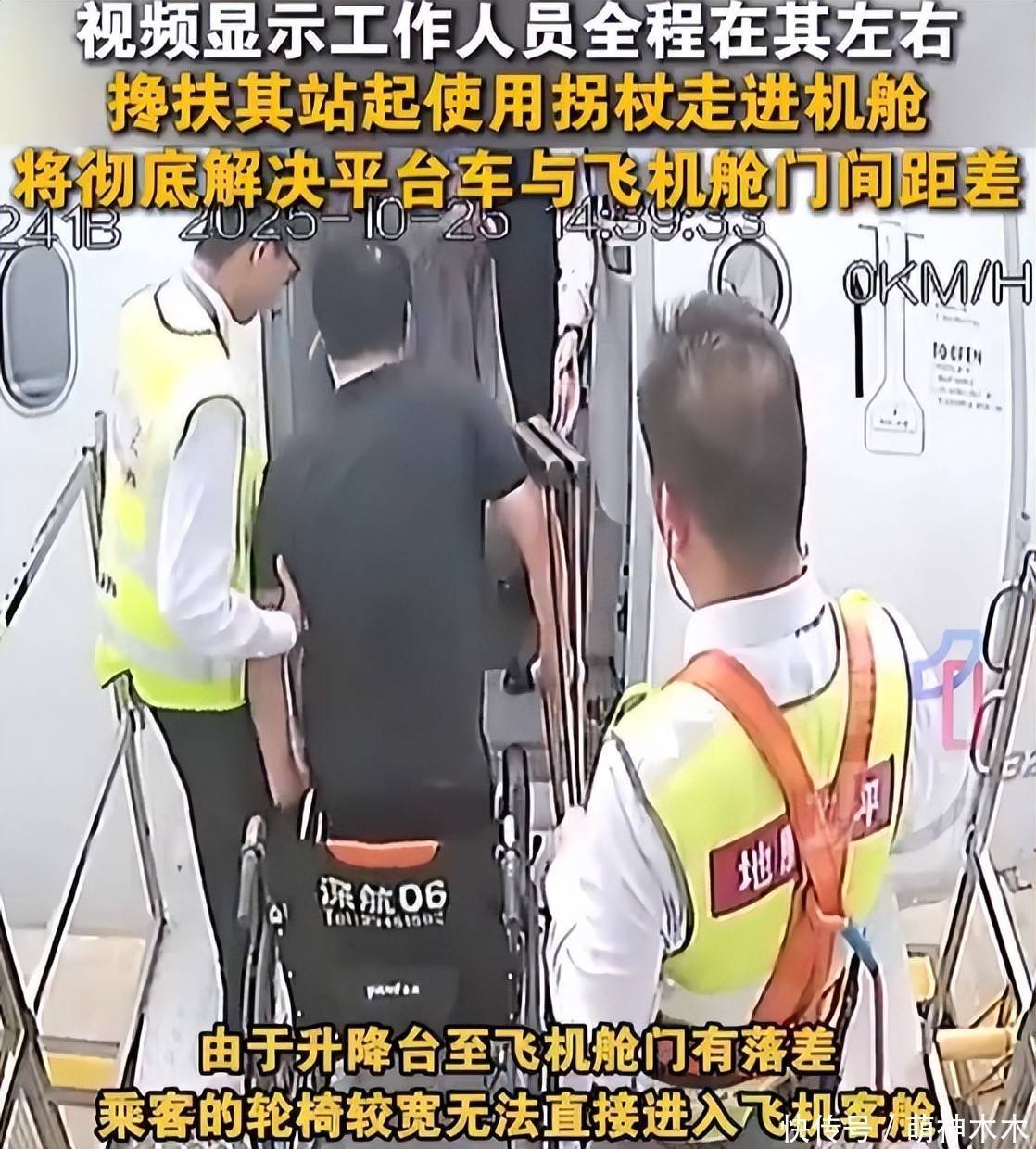 随后,深圳机场发文道歉表示整改,并放出郑智化登机视频,画面显示有两名工作人员辅助郑智化登机,先是工作人员推他至舱门,接着搀扶他拄着拐杖走进机舱,进舱的对面有工作人员接应。